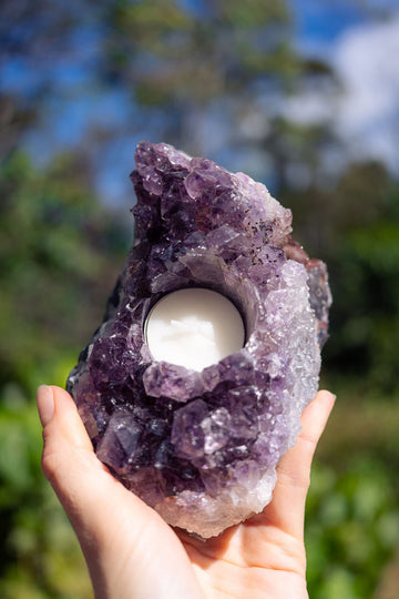 This functional Amethyst Candle Holder features divine crystal point formations with varying hues of rich purple. Draw attention to this stunning Amethyst cluster by lighting the tea-light candle, which is said to amplify peace and serenity, qualities that are strongly associated with this crystal. Each piece is entirely unique and perfect for your own home or to give as a gift.