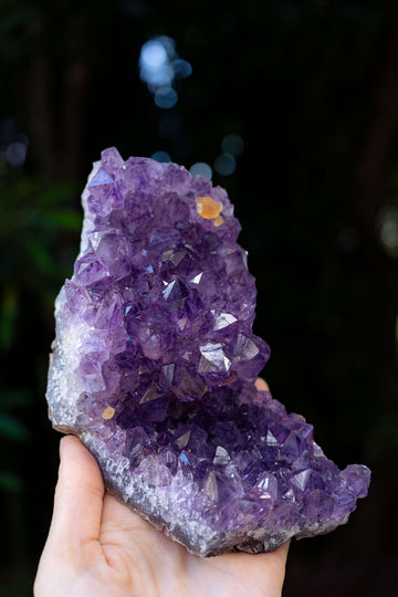 This awe-inspiring amethyst cluster will make an ideal feature piece for any space in the home or in a place of relaxation and healing. The purple amethyst crystal formations darken towards the multifaceted tips and have illuminating parts of clarity. This piece also showcases golden inclusions and delightful calcite formations. Amethyst is often used as a symbol of peace and unification. It is also thought to evoke feelings of serenity and calmness.