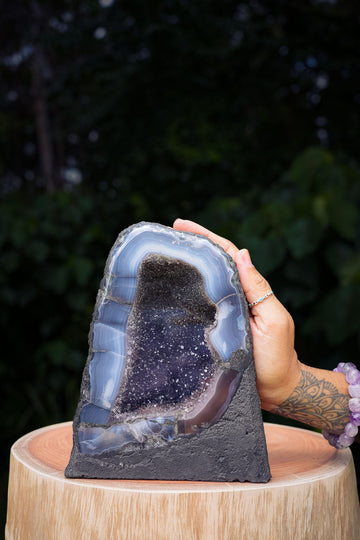 This stunning amethyst geode showcases a natural formation of delicate amethyst points with pink iron inclusions. This geode is beautifully bordered with blue lace agate, adding a soft contrast to the purples within. Each point sparkles with a unique shimmer, reflecting the light in a way that draws the eye. Perfect for collectors, crystal enthusiasts, or as a striking decorative piece, this geode will evoke feelings of serenity and calmness and bring about a sense of peace.