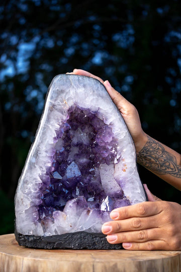 This awe-inspiring Amethyst geode will make an ideal feature piece for any space in the home or in a place of relaxation and healing. The purple amethyst crystal formations darken towards the multifaceted tips and have illuminating parts of clarity. Amethyst is often used as a symbol of peace and unification. It is also thought to evoke feelings of serenity and calmness.