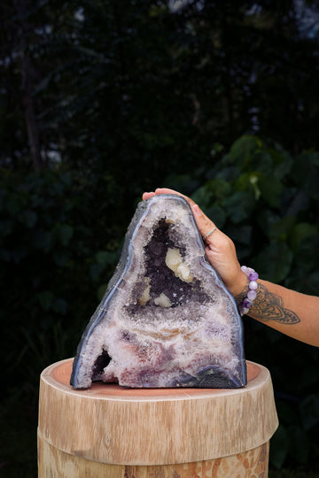 Behold this exquisite Amethyst Geode that shimmers with gentle natural beauty. Featuring delicate lavender quartz points, complemented by soft pink amethyst hues and sparkling calcite druzy within, this is a truly stunning, multi-dimensional piece that radiates calm and positive energy. Known for its healing properties, the lavender and pink tones promote peace and emotional balance, while the calcite druzy adds a touch of brilliance and texture. Perfect for collectors, crystal enthusiasts, or as a unique decorative piece, this geode brings serenity and elegance to any space.