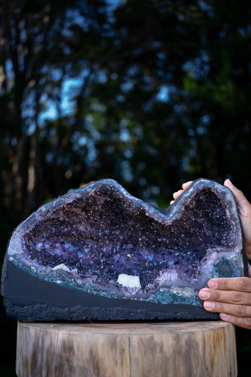 This stunning Violet Amethyst Geode showcases rich violet quartz points that sparkle with natural brilliance. The deep, vibrant colour of the crystals brings a sense of depth and energy to any space, making it a striking addition to your collection or décor. This piece showcases Calcite inclusions, making for an even more intriguing geode. Known for its calming and peaceful properties, the violet amethyst is believed to promote spiritual growth and inner peace. Ideal for crystal enthusiasts, meditation spaces, or as a meaningful gift, this geode radiates positive energy and enhances any environment.