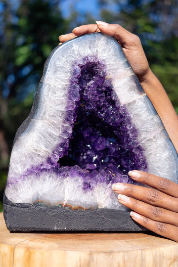 This stunning Violet Amethyst Geode showcases rich violet quartz points that sparkle with natural brilliance. The deep, vibrant colour of the crystals brings a sense of depth and energy to any space, making it a striking addition to your collection or décor. Known for its calming and peaceful properties, the violet amethyst is believed to promote spiritual growth and inner peace. Ideal for crystal enthusiasts, meditation spaces, or as a meaningful gift, this geode radiates positive energy and enhances any environment.