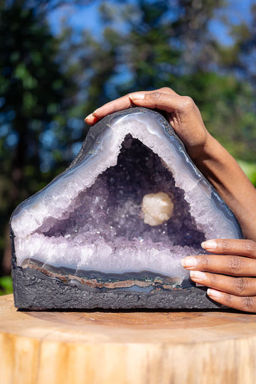 This stunning Violet Amethyst Geode showcases rich violet quartz points that sparkle with natural brilliance. The deep, vibrant colour of the crystals brings a sense of depth and energy to any space, making it a striking addition to your collection or décor. This piece showcases Calcite inclusions, making for an even more intriguing geode. Known for its calming and peaceful properties, the violet amethyst is believed to promote spiritual growth and inner peace. Ideal for crystal enthusiasts, meditation spaces, or as a meaningful gift, this geode radiates positive energy and enhances any environment.