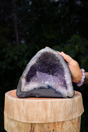 Discover the serene beauty of this Lavender Amethyst Geode, featuring delicate lavender points. Known for its calming and healing properties, this geode brings a peaceful energy to any room. Each point sparkles with a unique shimmer, reflecting the light in a way that draws the eye. Perfect for collectors, crystal enthusiasts, or as a striking decorative piece, this geode will evoke feelings of serenity and calmness and bring about a sense of peace.