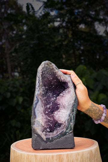 This stunning amethyst geode showcases a natural formation of brilliant violet amethyst points, varying in size to create a captivating texture and depth. This geode is beautifully bordered with delicate blue lace agate, adding a soft contrast to the rich purples within. The smooth, blue agate band encircles the opening of the geode, highlighting the intricate, natural formations of the amethyst points. Each point sparkles with a unique shimmer, reflecting the light in a way that draws the eye. Perfect for collectors, crystal enthusiasts, or as a striking decorative piece, this geode will evoke feelings of serenity and calmness and bring about a sense of peace.