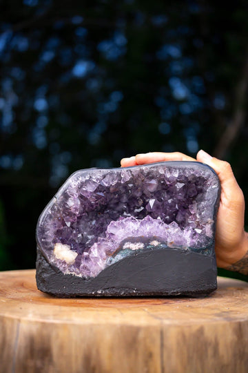 This enchanting and petite Amethyst Geode features Amethyst quartz points that shimmer with natural beauty and tranquility. Known for its calming properties, this geode brings peaceful energy to any space. Its sparkling crystals make it a perfect addition to your collection, home décor, or as a thoughtful gift. A beautiful symbol of serenity and inner peace, this geode adds an elegant touch to any setting.