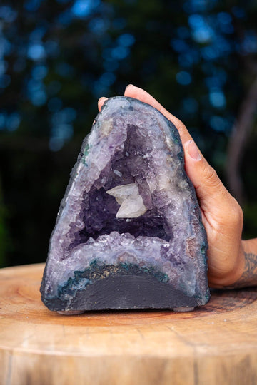 This enchanting and petite Amethyst Geode features Amethyst quartz points that shimmer with natural beauty and tranquility. Known for its calming properties, this geode brings peaceful energy to any space. Its sparkling crystals make it a perfect addition to your collection, home décor, or as a thoughtful gift. A beautiful symbol of serenity and inner peace, this geode adds an elegant touch to any setting.