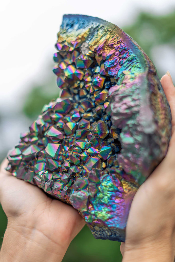 This beautiful and iridescent Rainbow Aura Cluster combines the ancient powers of alchemy and synergy through the electrostatic bonding of precious metals onto the surface of Amethyst. Rainbow Aura crystals are believed to expand the consciousness and heal the physical and spiritual body with their extraordinarily high vibration.