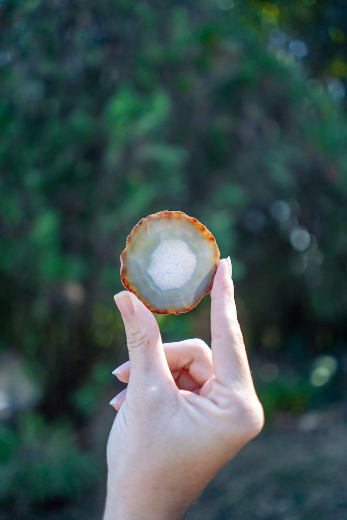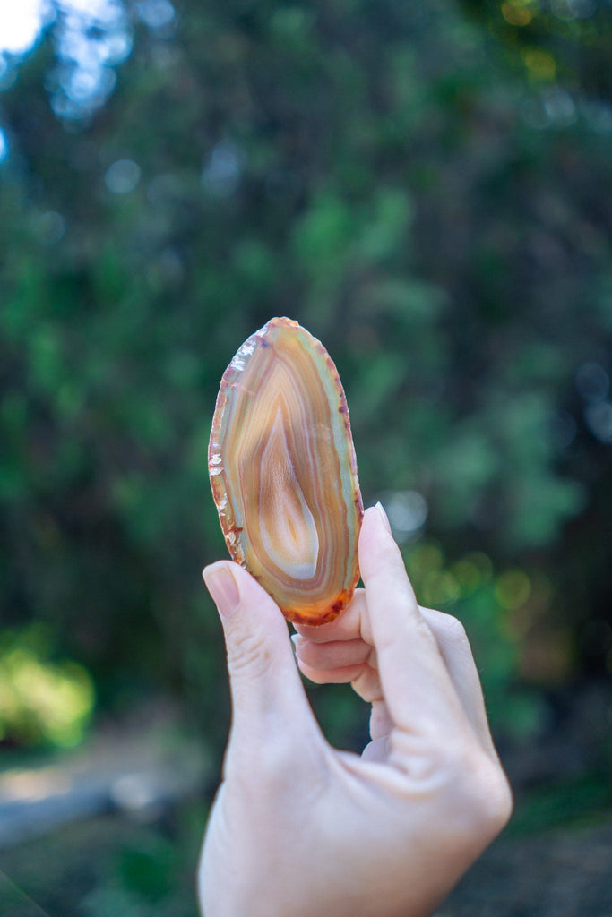 A vibrant slice of semi- transparent Carnelian Agate is a wonderful gemstone for grounding and to bring about self belief. It is also said to be a stone of motivation, making it easier for people to take action especially in creative endeavours.
