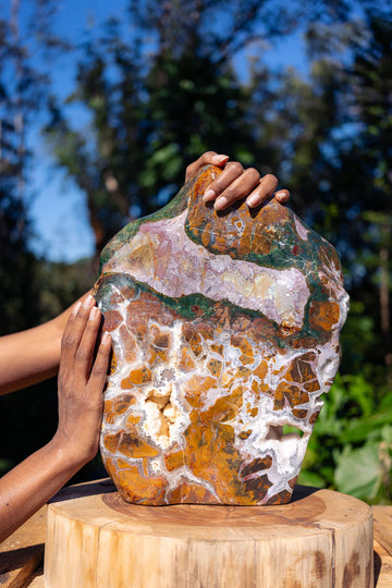 This precision polished Orbicular/ Ocean Jasper with its earthy tones and Clear Quartz inclusions will inspire a sense of awe and positivity. Orbicular Jasper is said to have a dynamic energy that could empower individuals to merge their willpower with their emotions, driving towards attainment of joy, happiness, and emotional equilibrium.