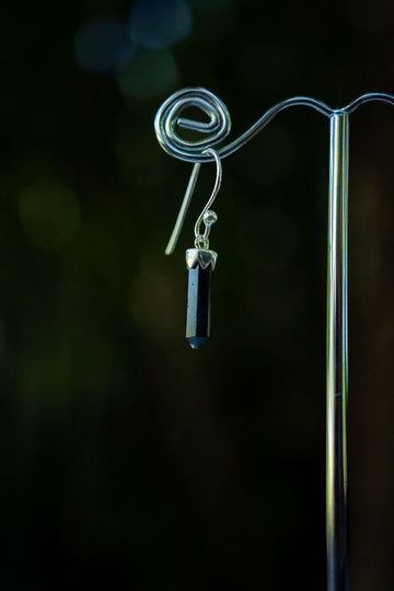 Delight in these petite Black Onyx point earrings that dangle from their elegant Sterling Silver setting. Black Onyx is said to aid in strengthening the will and helping with focus.