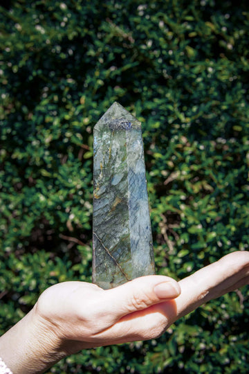 This tall polished prism has been meticulously faceted from A grade Labradorite. It features Labradorescence; light refracting magical flashes of blue, green and golden yellow tones. A stunning piece to be placed in a light-filled space for an alluring magical presence or for practical healing work and directional meditation.