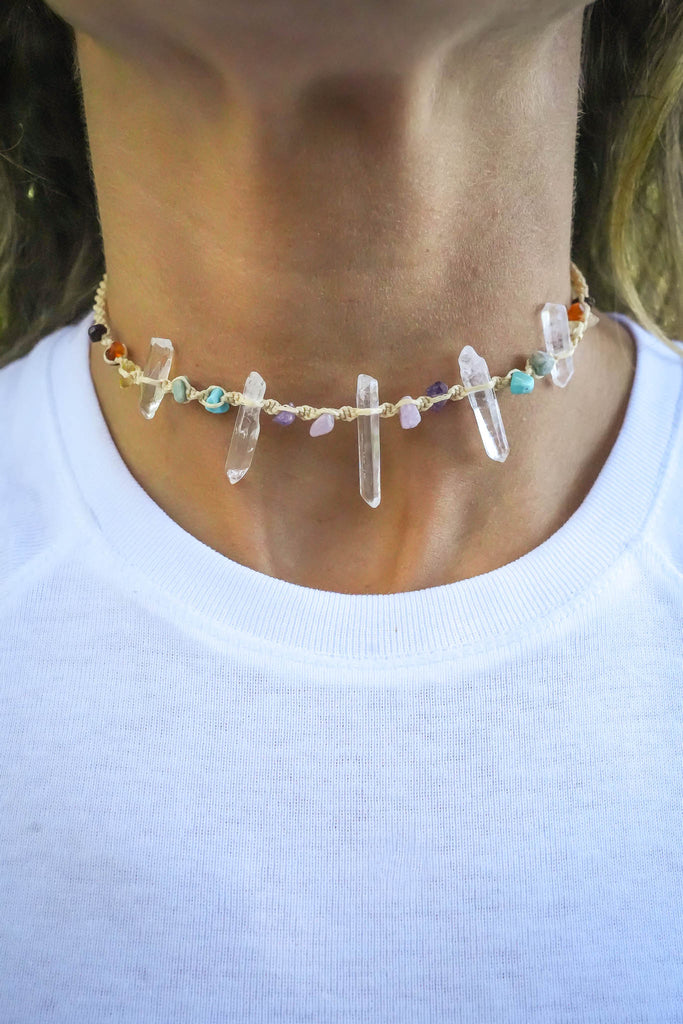 This intricately woven macramé necklace features a series of delicate Clear Quartz points, each encased beautifully in fine waxed cotton cord. Along the neckline, carefully selected chakra crystals add soft touches of colour that enhance the light, airy feel of the design. The adjustable length allows the necklace to be worn long or drawn higher into a choker style, depending on preference. This bespoke, one-of-a-kind piece is locally handcrafted in the Byron Bay region with loving intention by Manya of Mooka Designs, daughter of Naren King, founder of Crystal Castle.