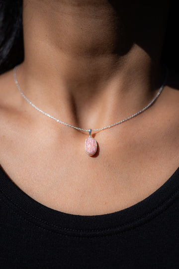 This Rhodochrosite rough showcases the delightful lacing and soft tones of this rare crystal. Set in 925 sterling silver, this necklace is the perfect adornment for any occasion. Rhodochrosite is believed to enhance emotional connection and openness to love.