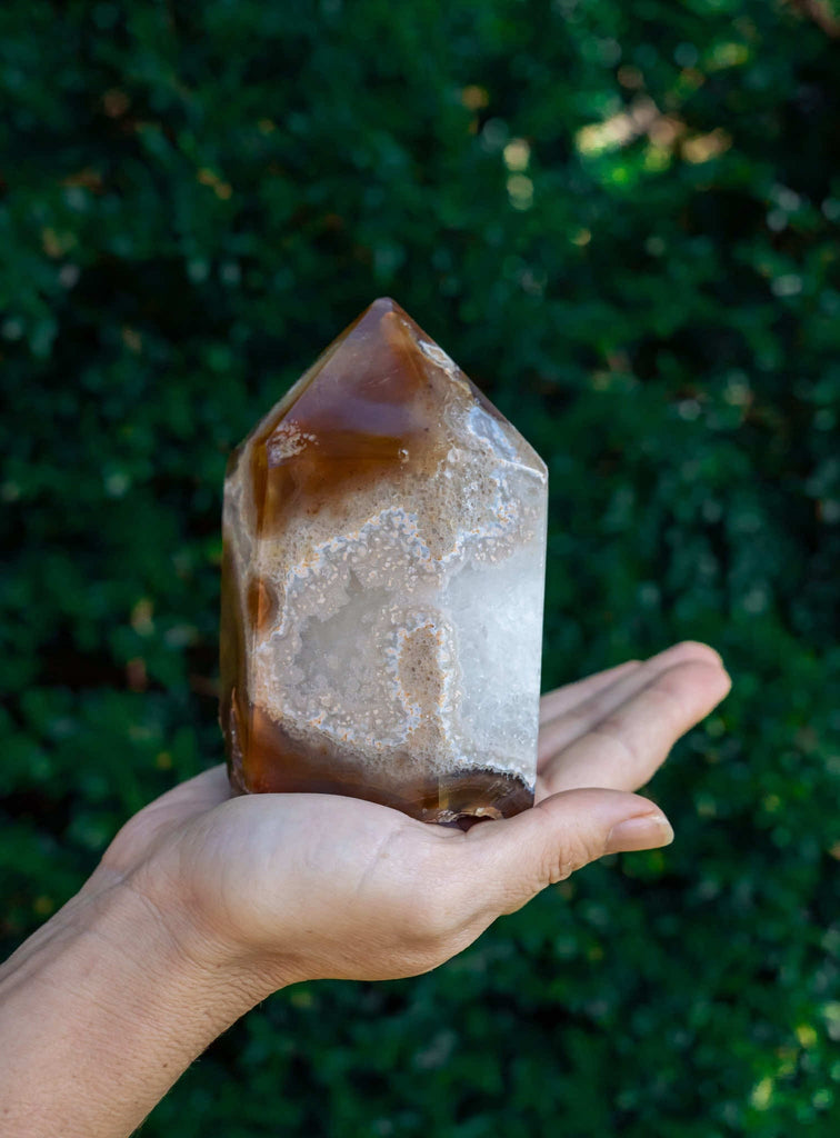 This luxurious Carnelian Agate Generator is perfectly polished into a powerful energy directing point formation. It will sit beautifully as a special piece within any living space or can be used for healing and meditation rituals. With its rich banded tones of warm golden brown, it's no surprise Carnelian is said to be a crystal of motivation, making it easier for people to take action especially in creative endeavours.