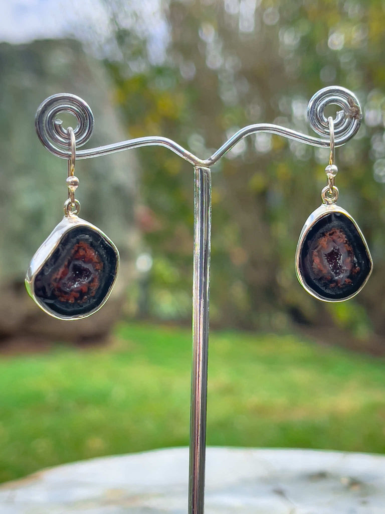 A stunning pair of Agate Geode earrings encapsulated in a solid 925 sterling silver setting. These Geode earrings feature bands of Agate surrounding a druzy center formation with sparkling crystals. A gorgrous pair of earrings to bring a touch of divine healing.