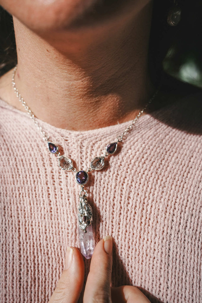 Crafted from 925 sterling silver, this exclusive necklace features a natural Vera Cruz Amethyst Point with a teardrop Pink Tourmaline, Herkimer Diamonds and ultra dark faceted Amethyst crystals.
