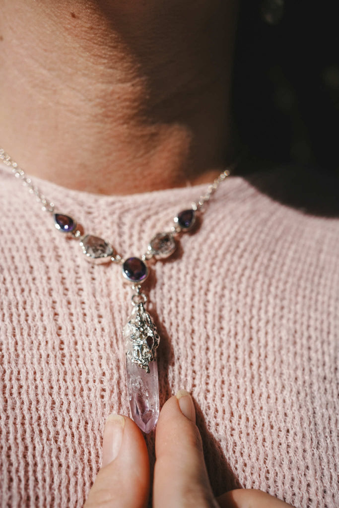 A celestial one-of-a-kind necklace meticulously designed to showcase a unique Vera Cruz Amethyst Point and carefully selected accompanying crystals. Vera Cruz crystals are a specific type of Amethyst only found in Vera Cruz, Mexico. They are known to form as long slender points, boast amazing lustre and clarity and have transitional colour.