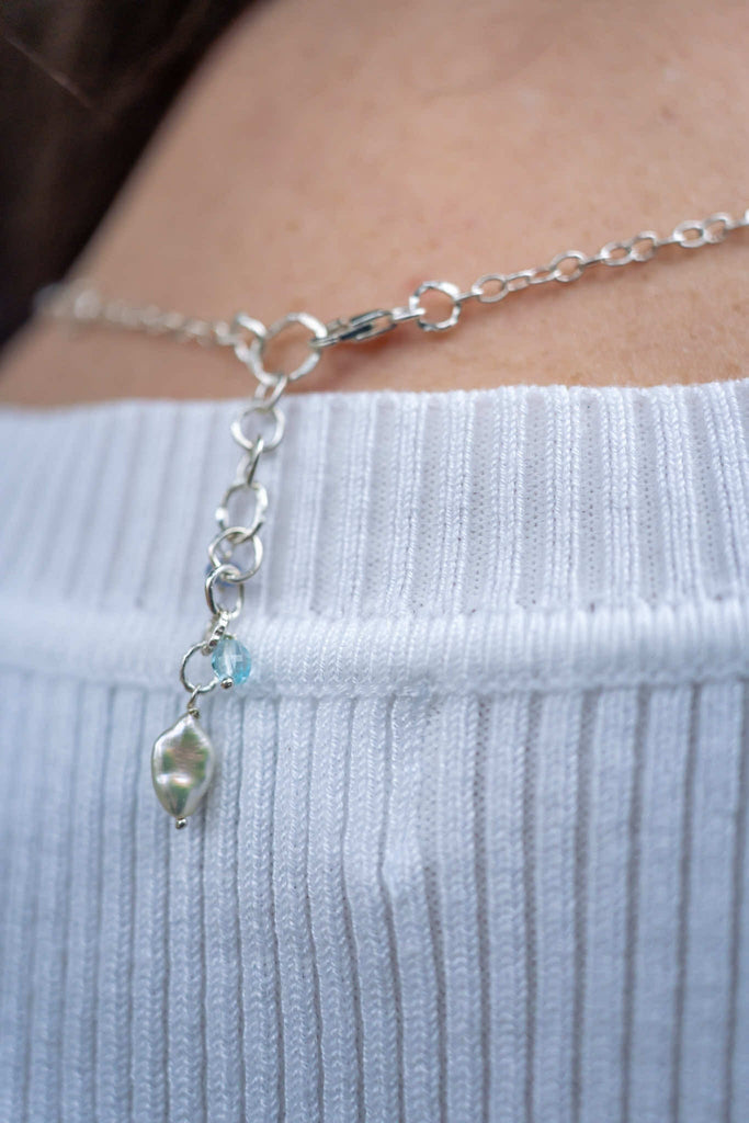 A celestial one of a kind necklace meticulously designed to showcase each carefully selected crystal. Crafted from 925 sterling silver, this exclusive necklace features an Aqua Aura natural point, with a large polished Larimar and accompanying Rainbow Moonstone, Green Tourmaline, and Tanzanite crystals. A truly divine piece that will enhance the uniqueness of the beholder.
