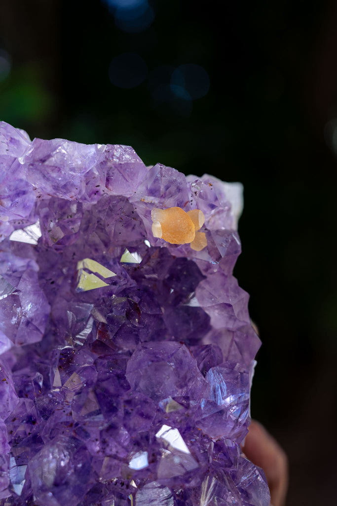This awe-inspiring amethyst cluster will make an ideal feature piece for any space in the home or in a place of relaxation and healing. The purple amethyst crystal formations darken towards the multifaceted tips and have illuminating parts of clarity. This piece also showcases golden inclusions and delightful calcite formations. Amethyst is often used as a symbol of peace and unification. It is also thought to evoke feelings of serenity and calmness.