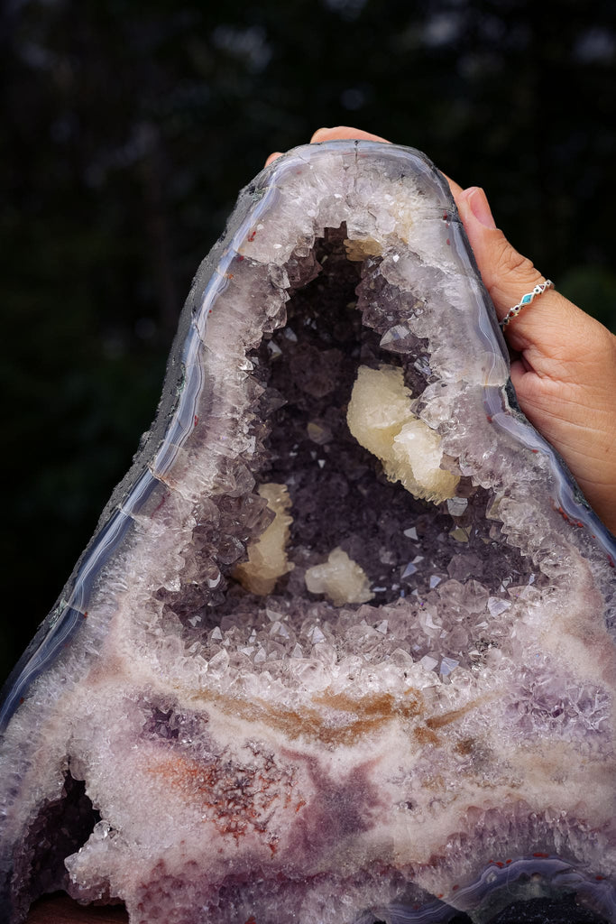 Behold this exquisite Amethyst Geode that shimmers with gentle natural beauty. Featuring delicate lavender quartz points, complemented by soft pink amethyst hues and sparkling calcite druzy within, this is a truly stunning, multi-dimensional piece that radiates calm and positive energy. Known for its healing properties, the lavender and pink tones promote peace and emotional balance, while the calcite druzy adds a touch of brilliance and texture. Perfect for collectors, crystal enthusiasts, or as a unique decorative piece, this geode brings serenity and elegance to any space.