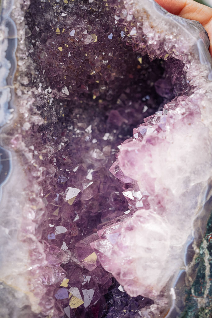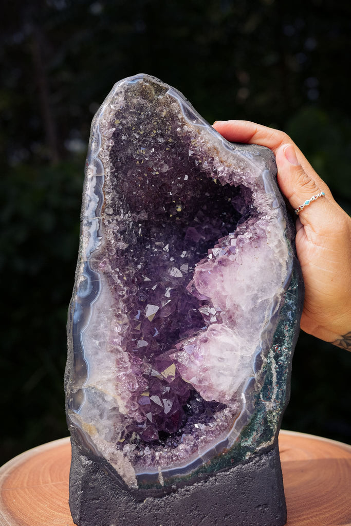 This stunning amethyst geode showcases a natural formation of brilliant violet amethyst points, varying in size to create a captivating texture and depth. This geode is beautifully bordered with delicate blue lace agate, adding a soft contrast to the rich purples within. The smooth, blue agate band encircles the opening of the geode, highlighting the intricate, natural formations of the amethyst points. Each point sparkles with a unique shimmer, reflecting the light in a way that draws the eye. Perfect for collectors, crystal enthusiasts, or as a striking decorative piece, this geode will evoke feelings of serenity and calmness and bring about a sense of peace.