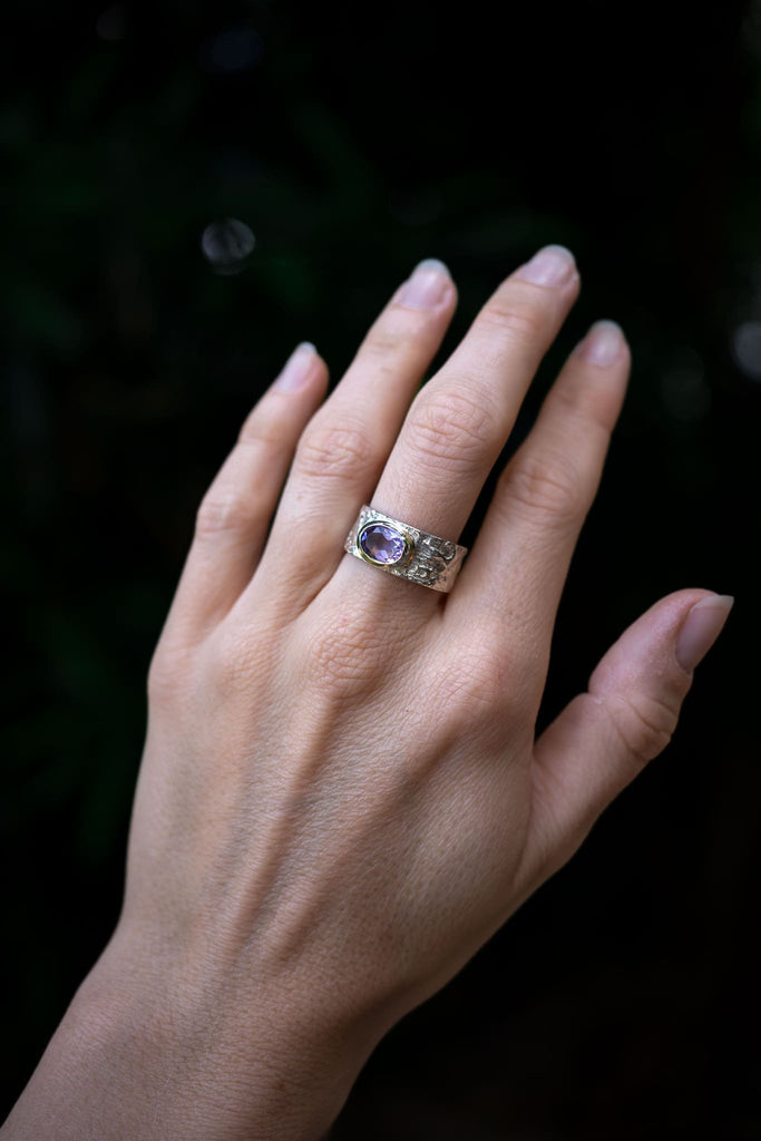 A stunning ornate ring with a perfectly polished Amethyst crystal encapsulated in silver and accented with gold plating. This beautifully designed bespoke ring is crafted with 925 sterling silver and features unique silver work around a faceted Amethyst crystal. Amethyst is said to bring peace into one's life and imbue one with a sense of calm serenity.