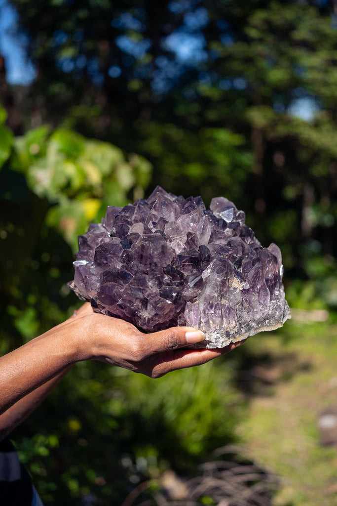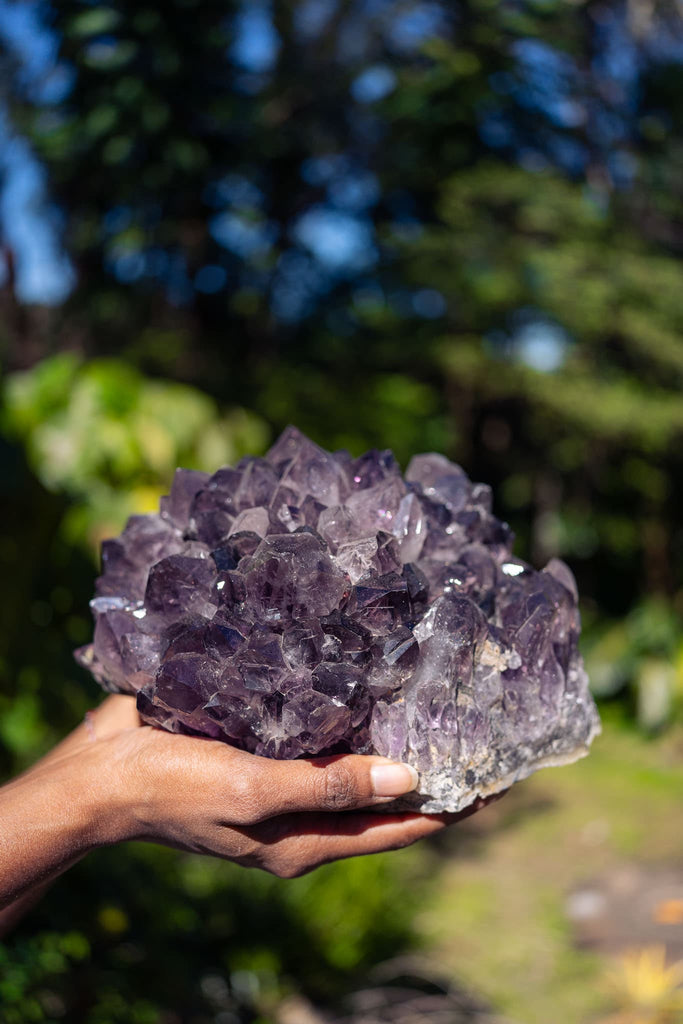 This awe-inspiring amethyst cluster will make an ideal feature piece for any space in the home or in a place of relaxation and healing. The purple amethyst crystal formations darken towards the multifaceted tips and have illuminating parts of clarity. Amethyst is often used as a symbol of peace and unification. It is also thought to evoke feelings of serenity and calmness.