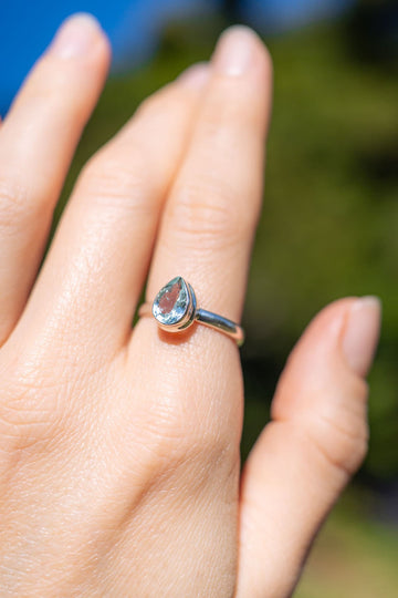 A beautiful and elegant Aquamarine ring created to delight the beholder. This simple yet striking ring is crafted with 925 sterling silver and features a faceted Aquamarine that sparkles and catches the light. Aquamarine is believed to bring the wearer tranquillity and renewal.