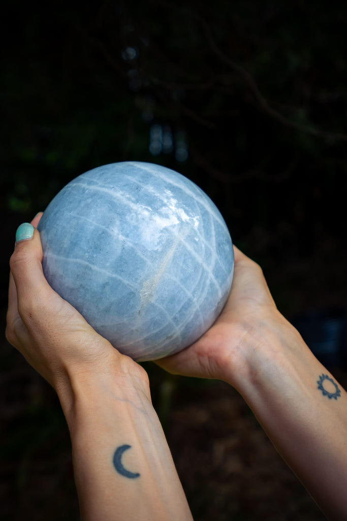 This large blue calcite sphere is simply divine. Marbled tones of blue range from soft pastel tones to rich deep pigmented hues with mesmerising fluidity. An absolute stunning feature that represents pure creativity. This gorgeous crystal will enhance any space with inspiring softness.