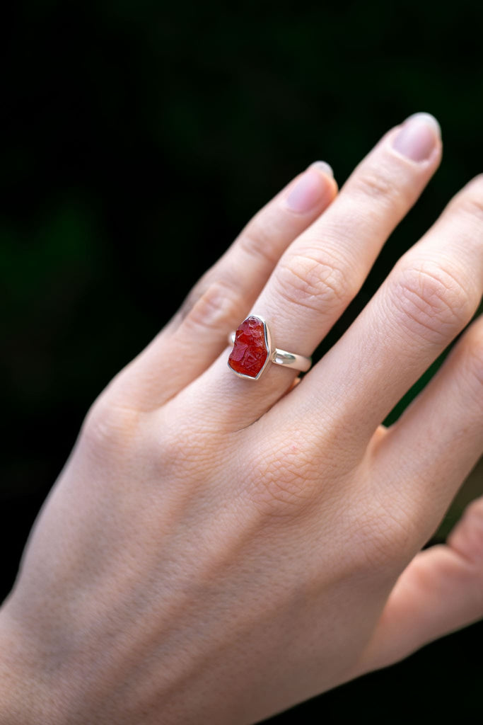 Find motivation in this divine sterling silver and Carnelian ring with its warm tone and organic shape. Carnelian is said to be deeply grounding and to bring about self belief. It is also said to be a crystal of motivation, making it easier for people to take action especially in creative endeavours.