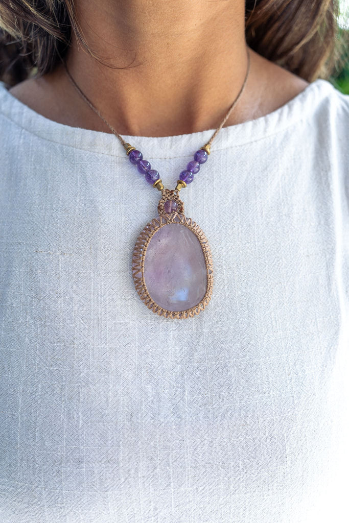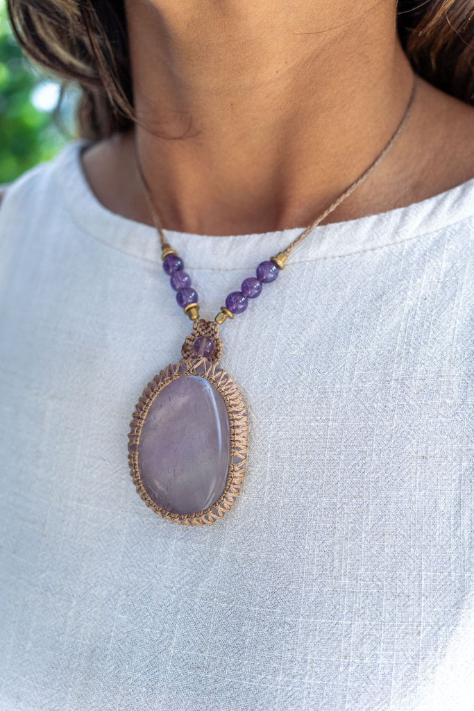 This intricately woven Macramé necklace features Lavender Fluorite and Amethyst beads, beautifully encased waxed cotton cord. The length of this piece is adjustable, making it wearable with length as a classic necklace or in a choker style, depending on preference. This bespoke, one of a kind necklace is locally handcrafted in the Byron Bay region with loving intention by Manya of Mooka Designs, the daughter of Naren King, founder of Crystal Castle.