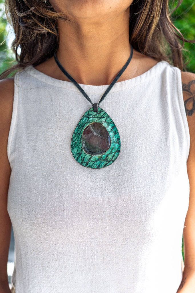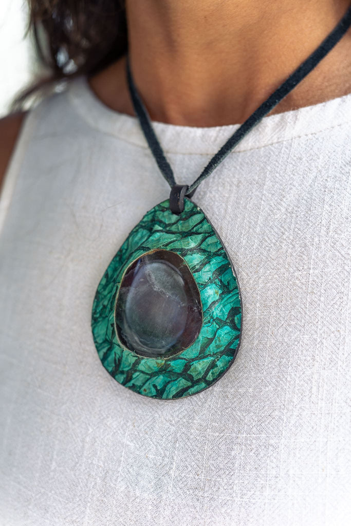 This magnificent necklace features an alluring Fluorite crystal encased beautifully using eco-friendly fish leather and up-cycled leather cord. The length of this piece is adjustable, making it wearable with length as a classic necklace or in a choker style, depending on preference. This bespoke, one of a kind necklace is locally handcrafted in the Byron Bay region with loving intention by Manya of Mooka Designs, the daughter of Naren King, founder of Crystal Castle.