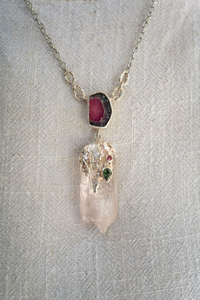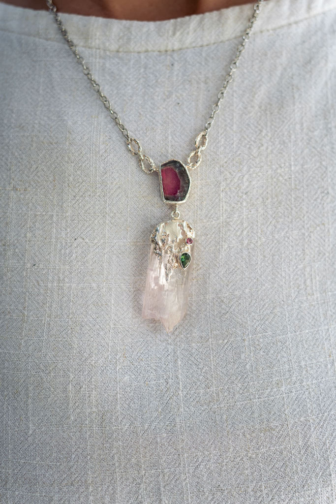 This elegant necklace features Kunzite and Watermelon Tourmaline, with stunning green and pink Tourmaline gems set in an intricate silver design. This exquisite piece blends the serene beauty of kunzite with the vibrant hues of tourmaline, creating a timeless accessory for any occasion. Perfect for those who appreciate fine details and sophisticated design, this necklace is sure to delight the beholder.