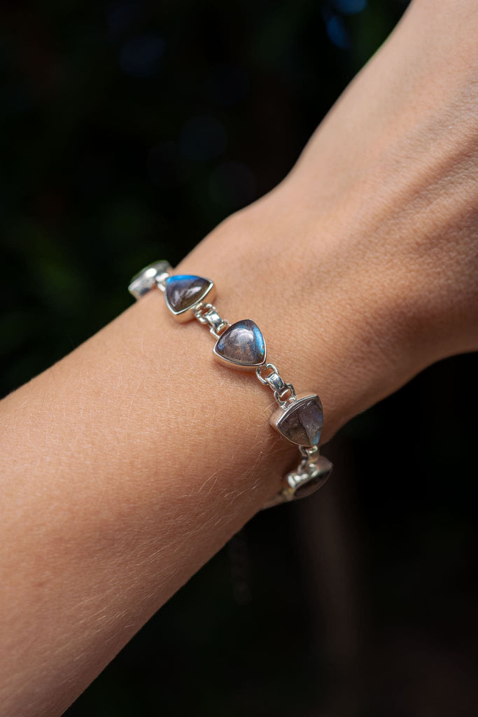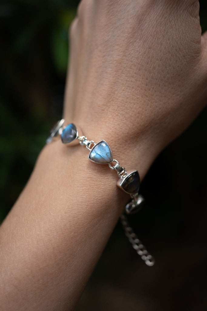 This bracelet is crafted from 925 sterling silver and features meticulously polished Labradorite crystals. These crystals feature labradorescence; light refracting magical flashes of colours. Labradorite is said to cast a protective shield around one’s Aura to protect against negativity and is known as a stone of transformation, enhancing strength of will and inner worth.