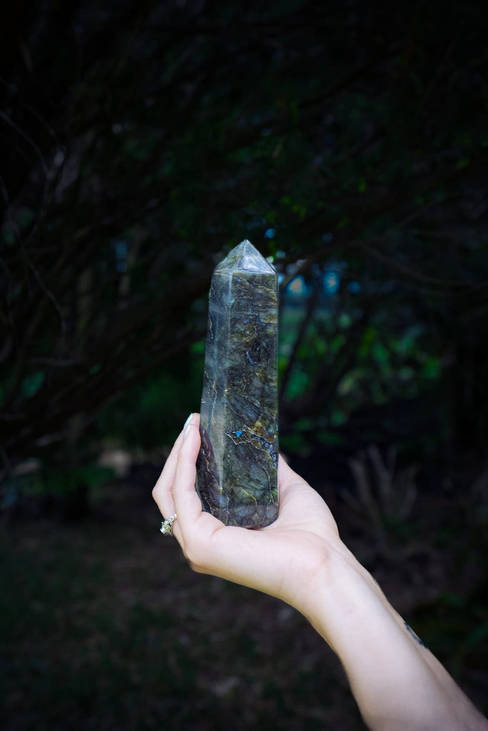 This glorious Labradorite Prism has been meticulously polished and faceted. It features labradorescence; light refracting magical flashes of an entire rainbow of colours. Labradorite is said to cast a protective shield around one’s Aura to protect against negativity and is known as a stone of transformation, enhancing strength of will and inner worth. A truly majestic crystal to be placed in a light-filled space for an alluring protective presence or for practical healing work and meditation.