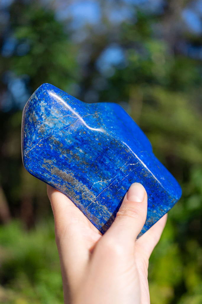 This vibrant blue Lapis Lazuli piece has been carefully crafted into a polished freeform. The rich blue tones are accompanied by metallic flecks of Pyrite and soft pastel Calcite marbling. Since the earliest of times, Lapis Lazuli has been associated with strength and courage, royalty and wisdom, intellect and truth. It was treasured by the ancient civilizations of Mesopotamia, Egypt, China, Greece, and Rome. This is a beautiful tactile soapstone to hold or use for massage to bring a touch of divine wisdom.