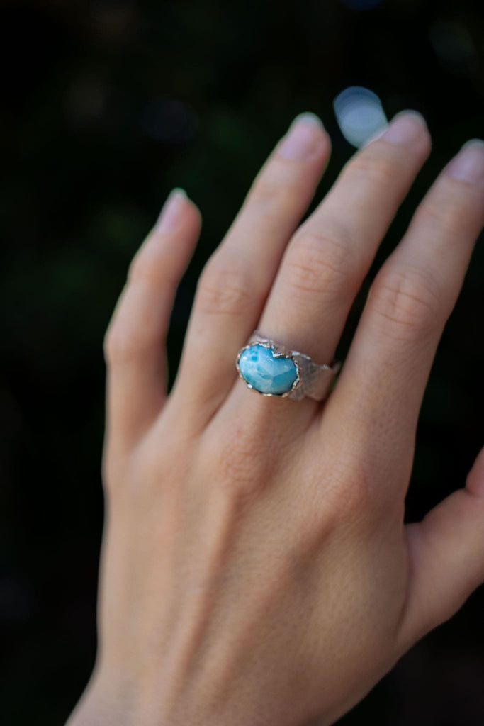 This bespoke ring features a beautiful Larimar (Dolphin Stone) encapsulated in a solid 925 sterling silver setting. This Larimar crystal has soft-hued blue tones marbled with pearly whites and will bring the beholder tranquillity and soothing support. Larimar is believed to be a calming crystal that promotes deep relaxation.