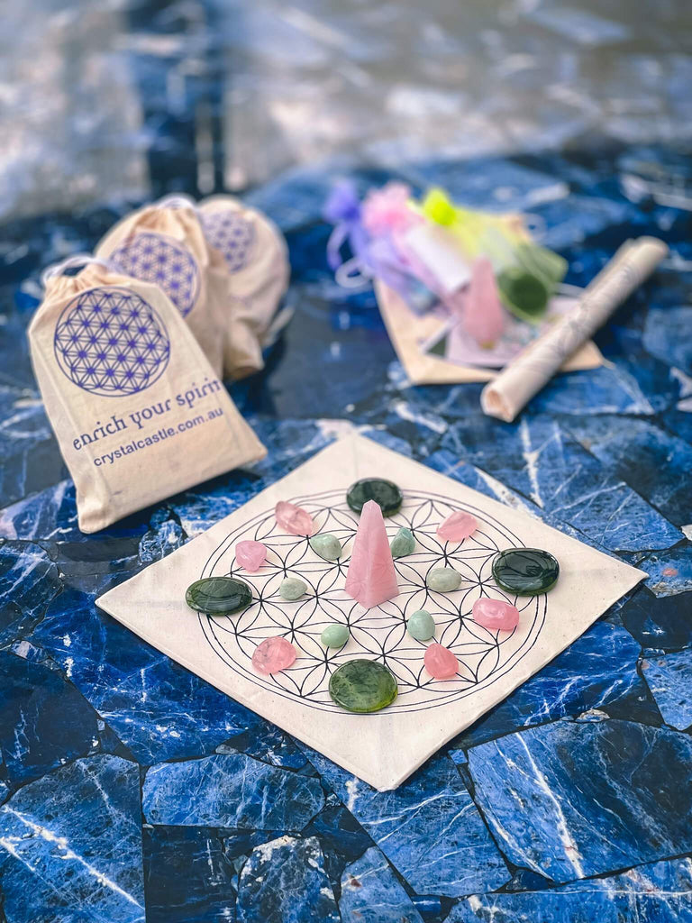 A crystal grid combines the energy of crystals, sacred geometry and specific intentions for the purpose of focusing and amplifying energy towards a particular goal. This all inclusive crystal grid pack has been carefully curated specifically to assist in manifesting self love, joy, relationships, transformation and healing into your life.