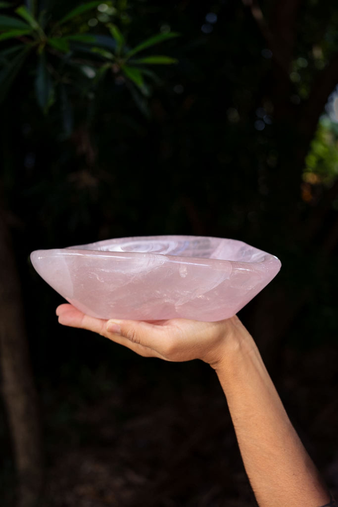 This luxurious and truly awe-inspiring Rose Quartz bowl is artisan carved and polished to perfection. This bowl has soft flowing contours of marbled quartz that curve with mesmerising fluidity that is enhanced by an ultra smooth and delightful surface. The blushing tones of high-grade Rose Quartz are illuminated through windows of semi-transparency creating a truly magical feature piece to behold. With its tender pink hue, it's no surprise Rose Quartz is said to reflect the pure and unconditional love of the heart. Use for meditation, as a practical piece in the home or simply admire and soak up the wonderful qualities of this piece.