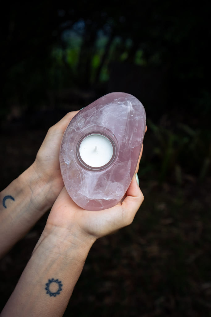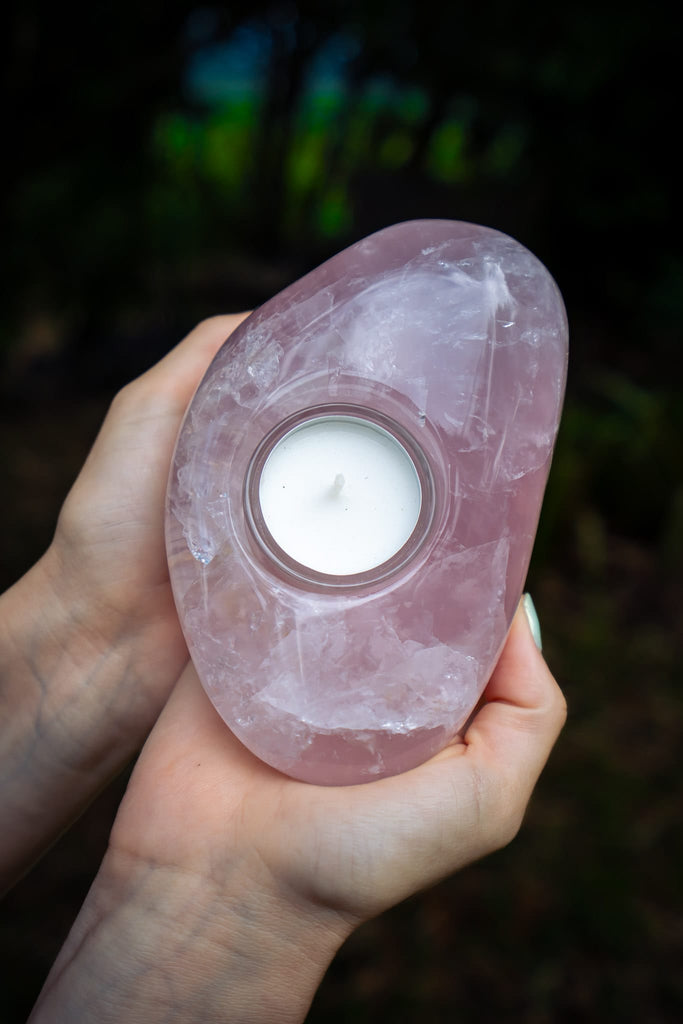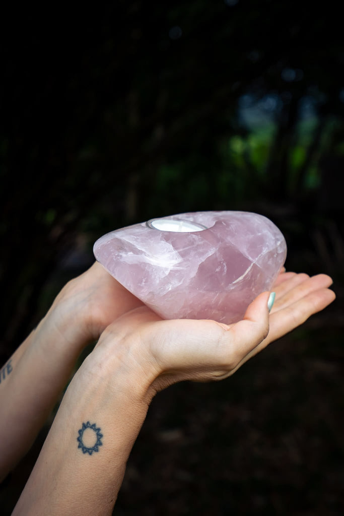 This tea light candle holder has been lovingly carved from Rose Quartz. Rose Quartz is associated with love, the heart and beauty, and is thought to be a healing aid for the heart Chakra. A functional and stunning light reflecting piece to cast gentle warmth into any space.
