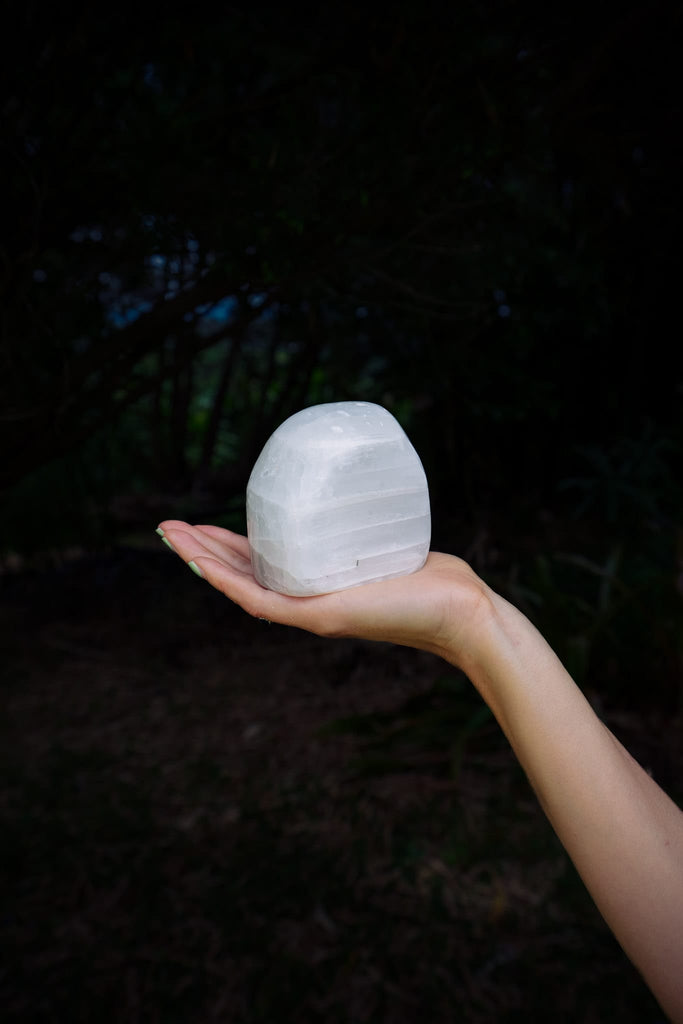 This polished Selenite freeform is beautiful and calming, showcasing the subtle patterns and striations within as well as an ethereal pearlescence. Selenite is most closely associated with the crown chakra, which represents wisdom and spirituality. It is commonly used by crystal practitioners as a way to cleanse the body, mind and spirit of negativity, and to cleanse other crystals by simply sitting them together.