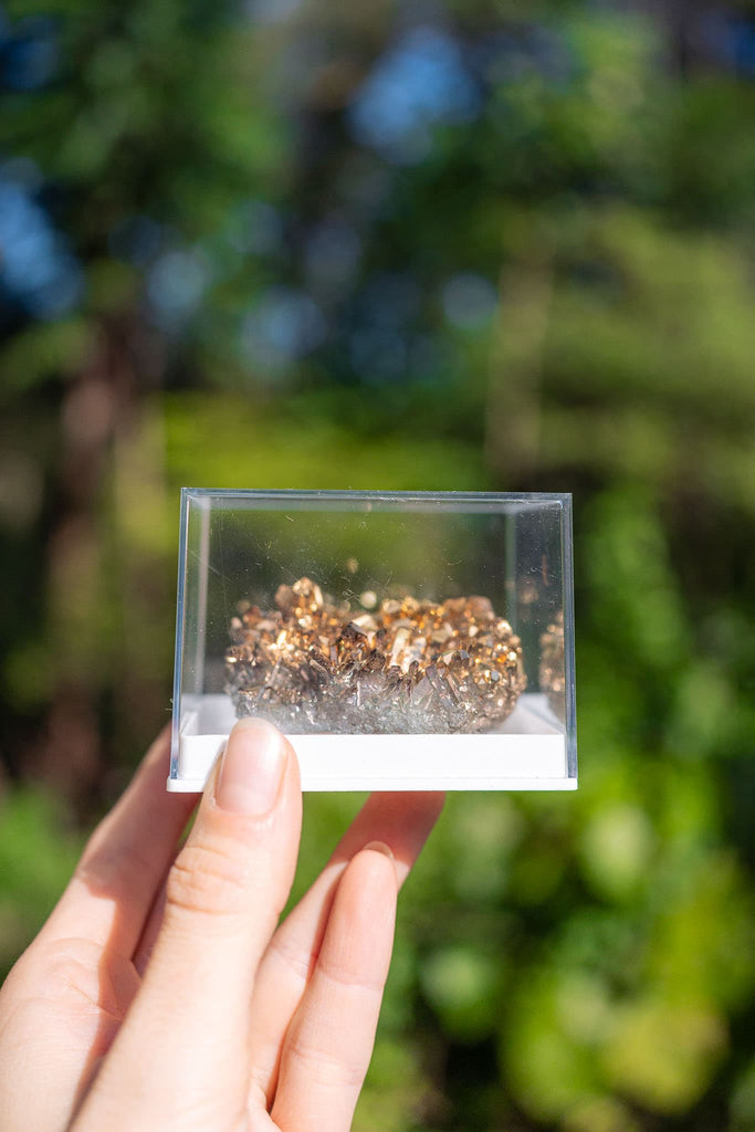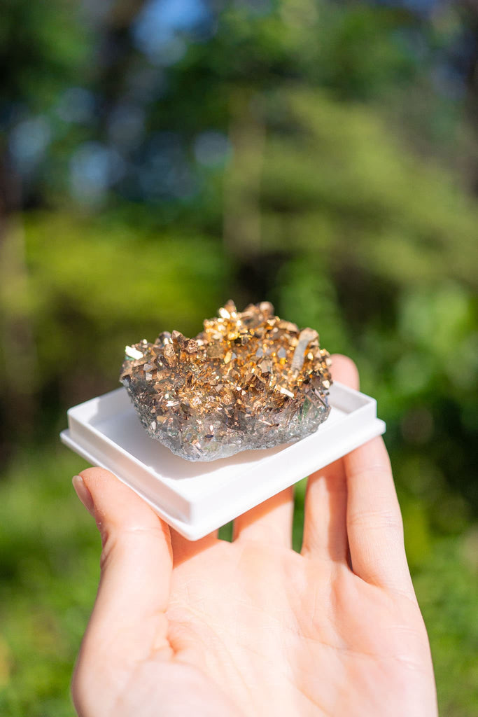 This Sunshine Aura Quartz is beautifully gold-plated, with shimmering golden hues and iridescent glow. Said to radiate vibrant energy, it makes a captivating centerpiece or a joyful addition to any collection. Known for its uplifting qualities, Sunshine Aura Quartz is believed to inspire positivity, clarity, and warmth—perfect for brightening a space. It also comes in a small display case, ready to shine wherever it’s placed.
