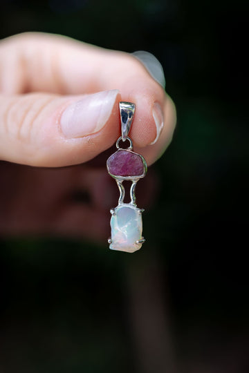 This unique pendant showcases the magic of Opal and Tourmaline together in this unique Sterling Silver setting. Opal is said to have a calming and centering effect while Tourmaline is believed to aid in matters of the heart.
