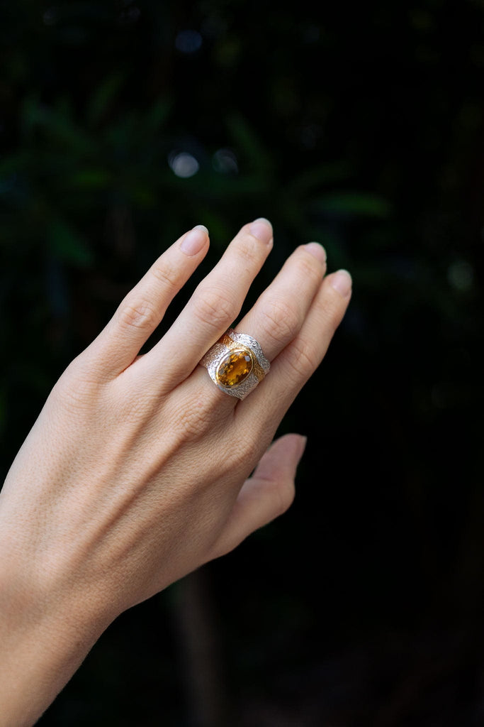 A truly stunning and majestic ring with a perfectly polished and faceted Citrine crystal encapsulated in 22k gold plating. This beautifully designed bespoke ring is crafted with 925 sterling silver and features unique gold and silver layered bands with an organic texture around the stunning crystal. Citrine is said to bring the wearer abundance and prosperity.