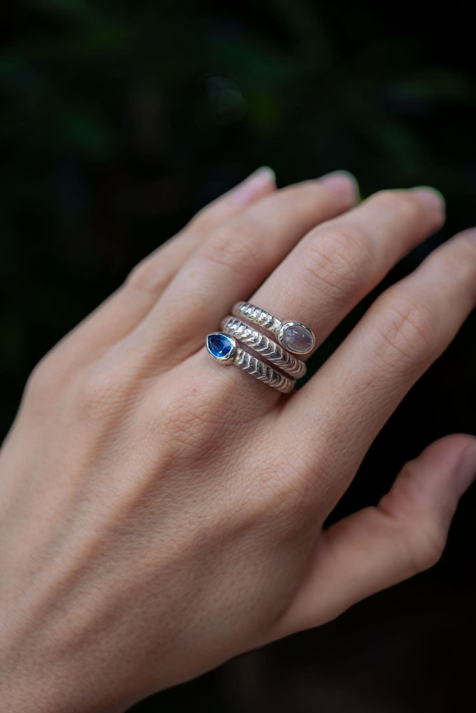 This ring is a true delight to wear and behold. Crafted with 925 Sterling Silver, it features a coiled serpent band with a stunning deep blue, faceted teardrop Kyanite with an oval cabochon Rainbow Moonstone. While Kyanite is associated with the throat chakra and is believed to strengthen the voice, Rainbow Moonstone is thought to bring balance, harmony and hope while enhancing creativity, compassion, and inner confidence.
