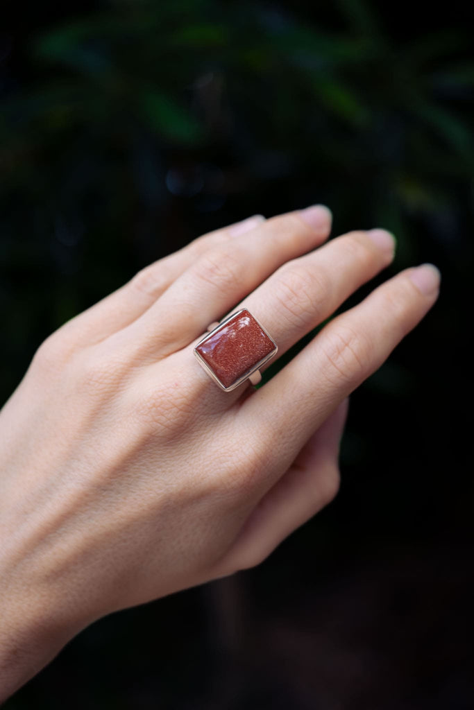 A sparkling Red Goldstone sits atop a simple 925 Sterling Silver band to create this beautiful ring. The angular cut of this Gold Stone makes for an unusual and striking piece. Red Goldstone is said to bring luck and good fortune to the beholder, making it a fortuitous addition to any jewellery collection.