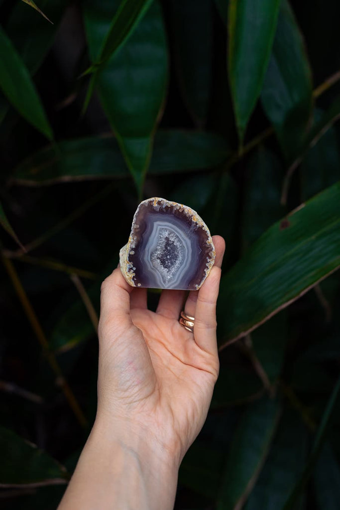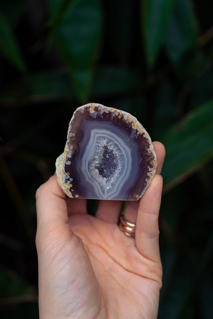 This petite perfectly standing Blue Lace Agate Cave will make a magical addition into any space. Featuring Blue Lace Agate banding and a sparkling crystal centre. With its soft blue/grey colour, it's no surprise Blue Lace Agate is said to be a soothing stone that exudes a calm graceful energy. The ideal size to be displayed beside a bed, mantle or on a desk to bring about a touch of divine healing and serenity.