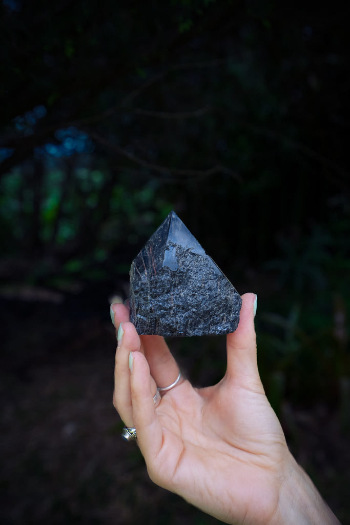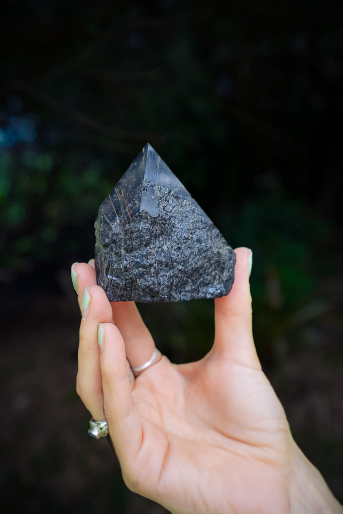 This powerful piece of Black Tourmaline comes in the form of a polished point. Featuring impressive linear formations with striking iron inclusions that perfectly showcase the complex structure that is uniquely characteristic of black tourmaline. Known as the personal crystal bodyguard, Black Tourmaline is believed to be highly protective and to absorb negative energy.